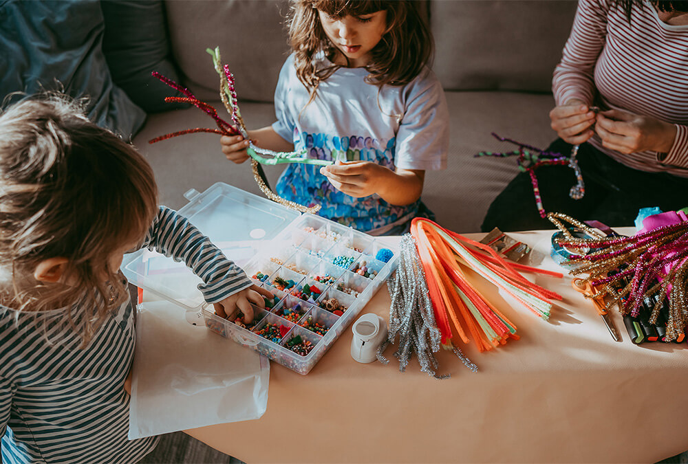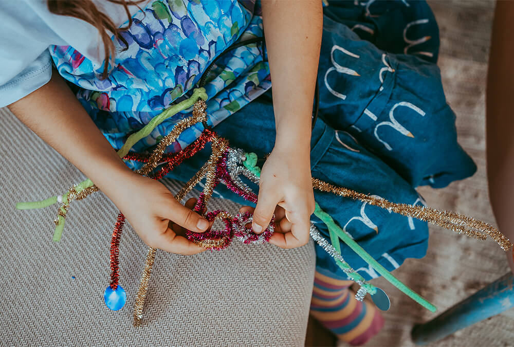 Aus einem Haarreif und den flauschigen Drähten lässt sich kinderleicht außergewöhnliche Haarschmuck zaubern. Wer mag, dekoriert noch mit Perlen aus dem Perlenfundus und Pompoms. Die lustigen Pompoms lassen sich am besten mit Heißkleber anbringen.