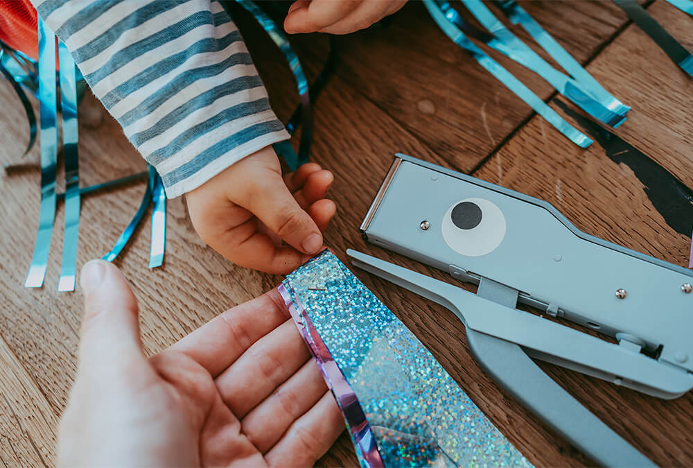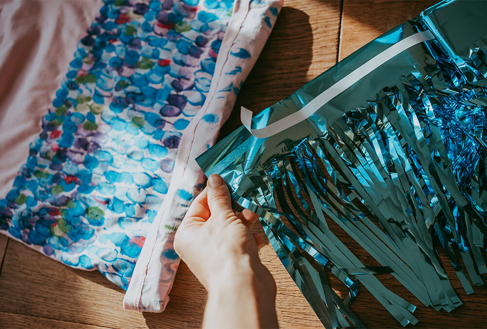 Auch Folienstreifen eignen sich wunderbar, um flatternde Umhänge zu gestalten. Wer mutig ist, heftet die Streifen einfach mit einer Heftzange an das T-Shirt. Sollten die Heftklammern im Inneren stören, kannst du sie mit einem Stück Heftpflaster weich abdecken.