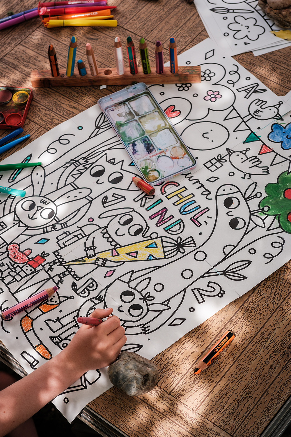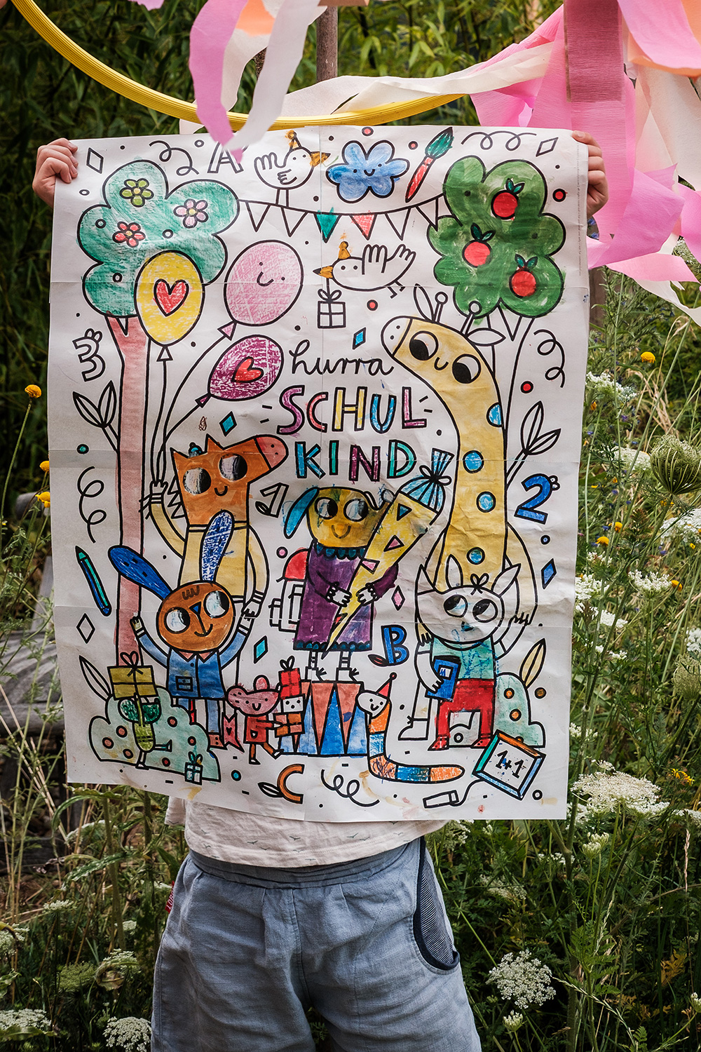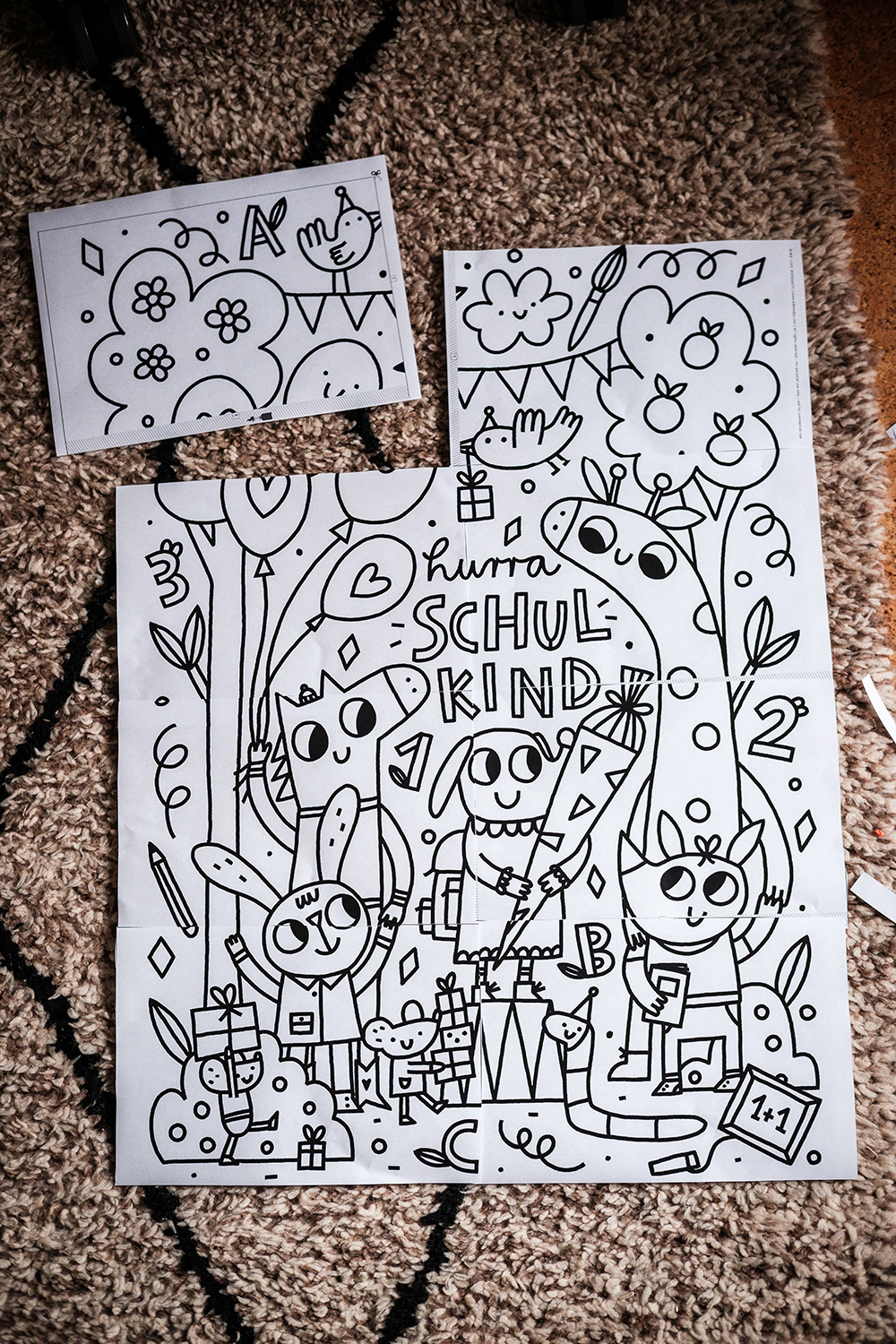 Hurra, endlich Schulkind! Jetzt malen wir uns den Start in die schönste Schulzeit mit all unseren Gästen kunterbunt – und das im extra großen XL-Format. Dank des Ausmalposters hast du gleich ganz viele kreative Möglichkeiten und die schönste Beschäftigung für die ganze Familie. Du kannst die Motive kunterbunt ausmalen oder das Poster als Pausvorlage für Kunst mit abwischbaren Kreidestiften auf deinen Fensterscheiben verwenden. Mache doch einfach beides!