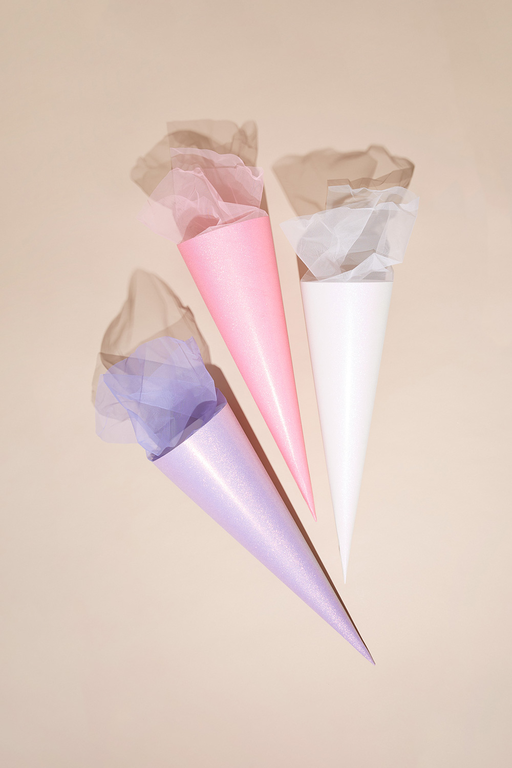Dank des schon integrierten Tüllverschlusses kannst du dich bei diesem Bastel-Rohling komplett auf das Dekorieren konzentrieren und wirst in wenigen Bastelschritten deine ganz persönliche Traumtüte in den Händen halten.