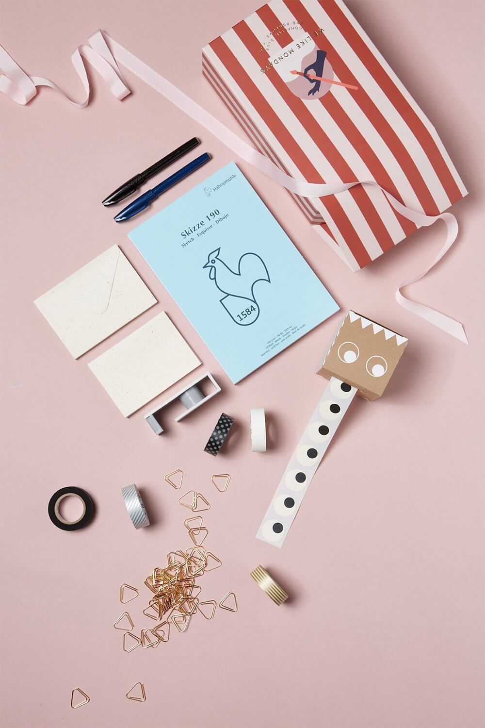 Die kleine Schatzkiste mit unseren schönsten Produkten für den Schreibtisch und einen minimalistischen Kreativfundus hat schon viele Fans gefunden und ist eine fabelhafte Idee für Menschen, die lieber etwas leiser kreativ sind. Wer liebt nicht das gute japanische Masking Tape in schlichten Farben, ganz besondere goldene Büroklammern, tolles Malpapier, Premium Karten und Umschläge und die berühmten Pentel Brush Sign Pens? Augensticker machen einfach allen Spaß, versprochen!