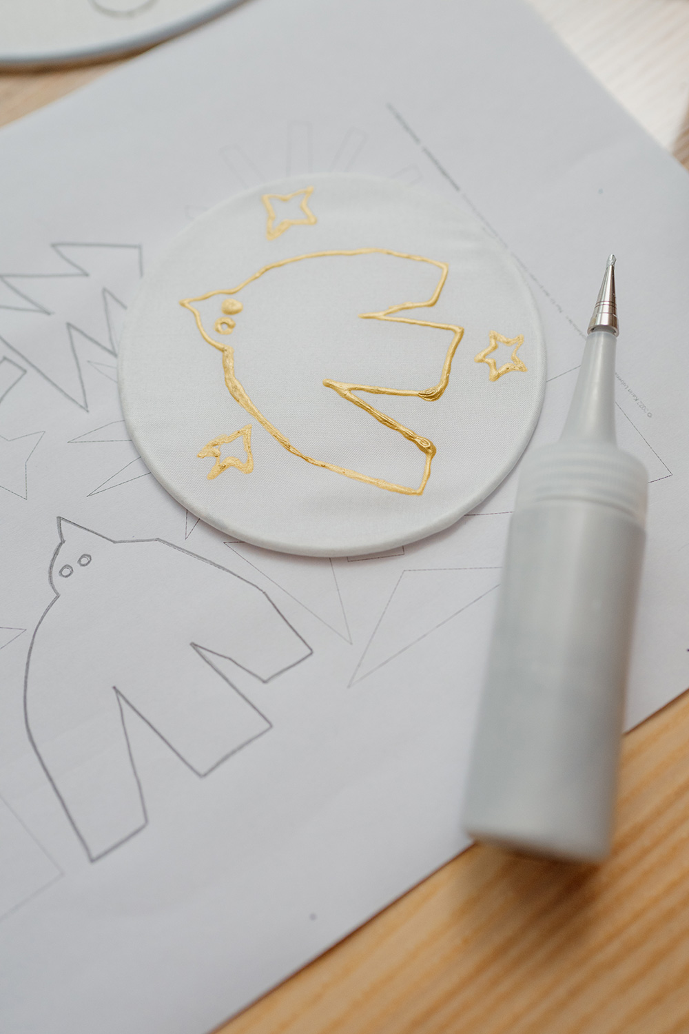 Zum sehr feinen Arbeiten mit Konturmittel empfehle ich dir, eine Aufsteckfeder zu verwenden. Damit ist das Zeichnen gleichmäßiger Linien deutlich einfacher.