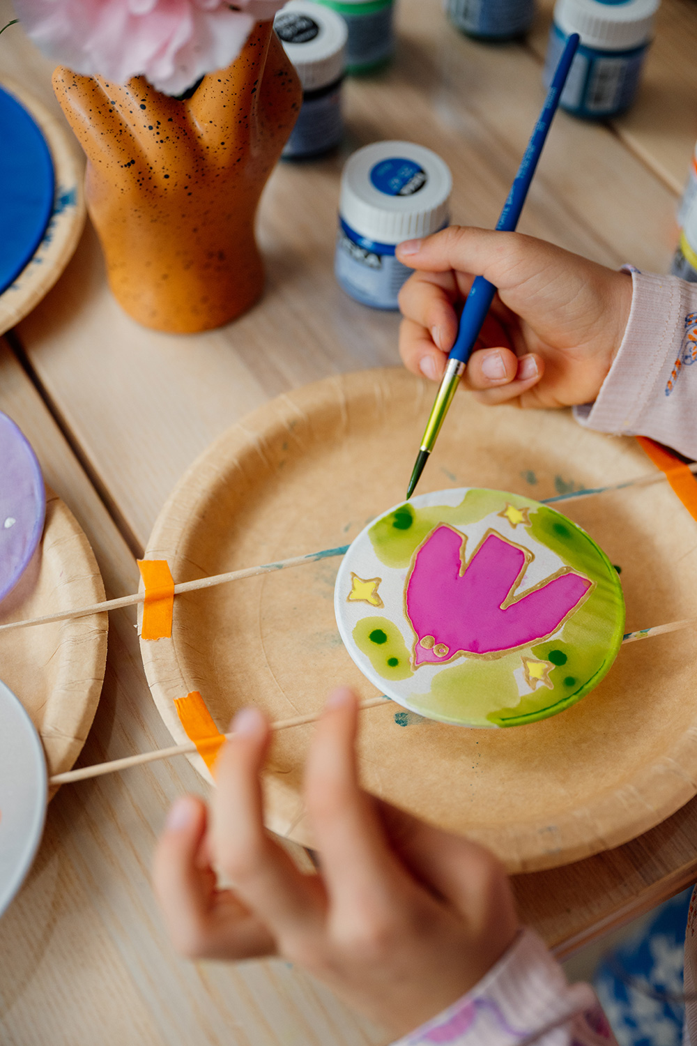 Pappteller sind optimal, um sie als Auffang für überschüssige Farbe unter deinen Seidenring zu legen. Bei kleineren Ringen helfen Holzstäbchen mit.