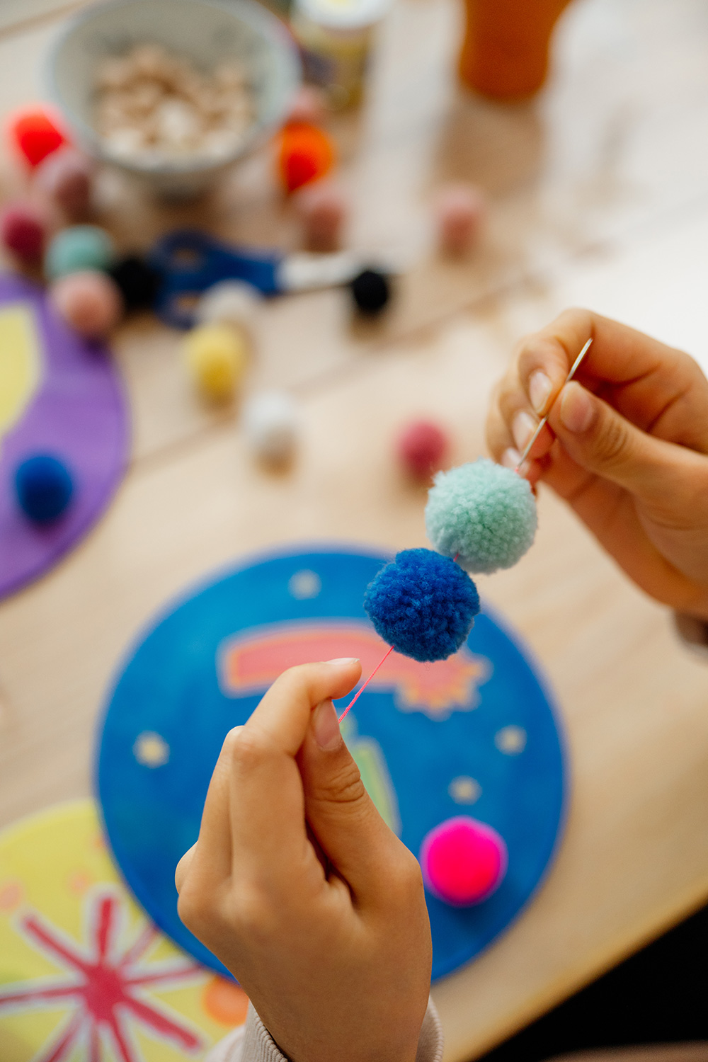 Wenn dann das finale Seiden-Kunstwerk noch mit Pompoms und Kristallen getoppt wird, kommt hier niemand mehr aus dem Staunen raus und bei den bunten Fensterbildern träumen wir von Winterzauber.