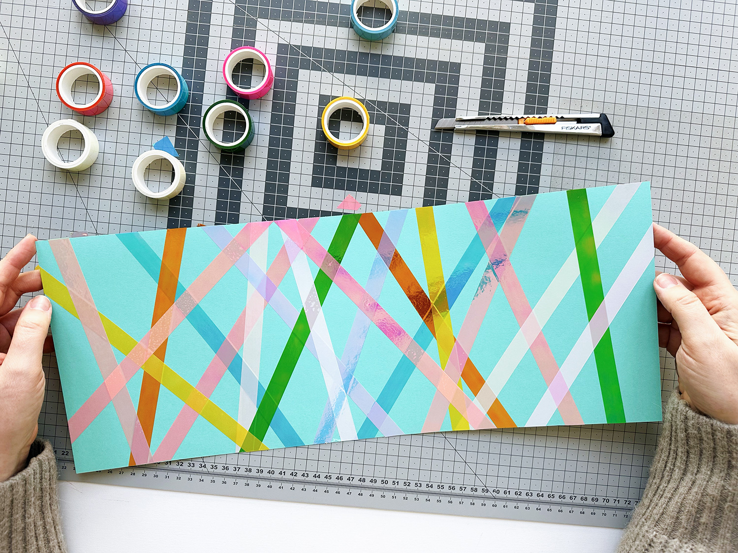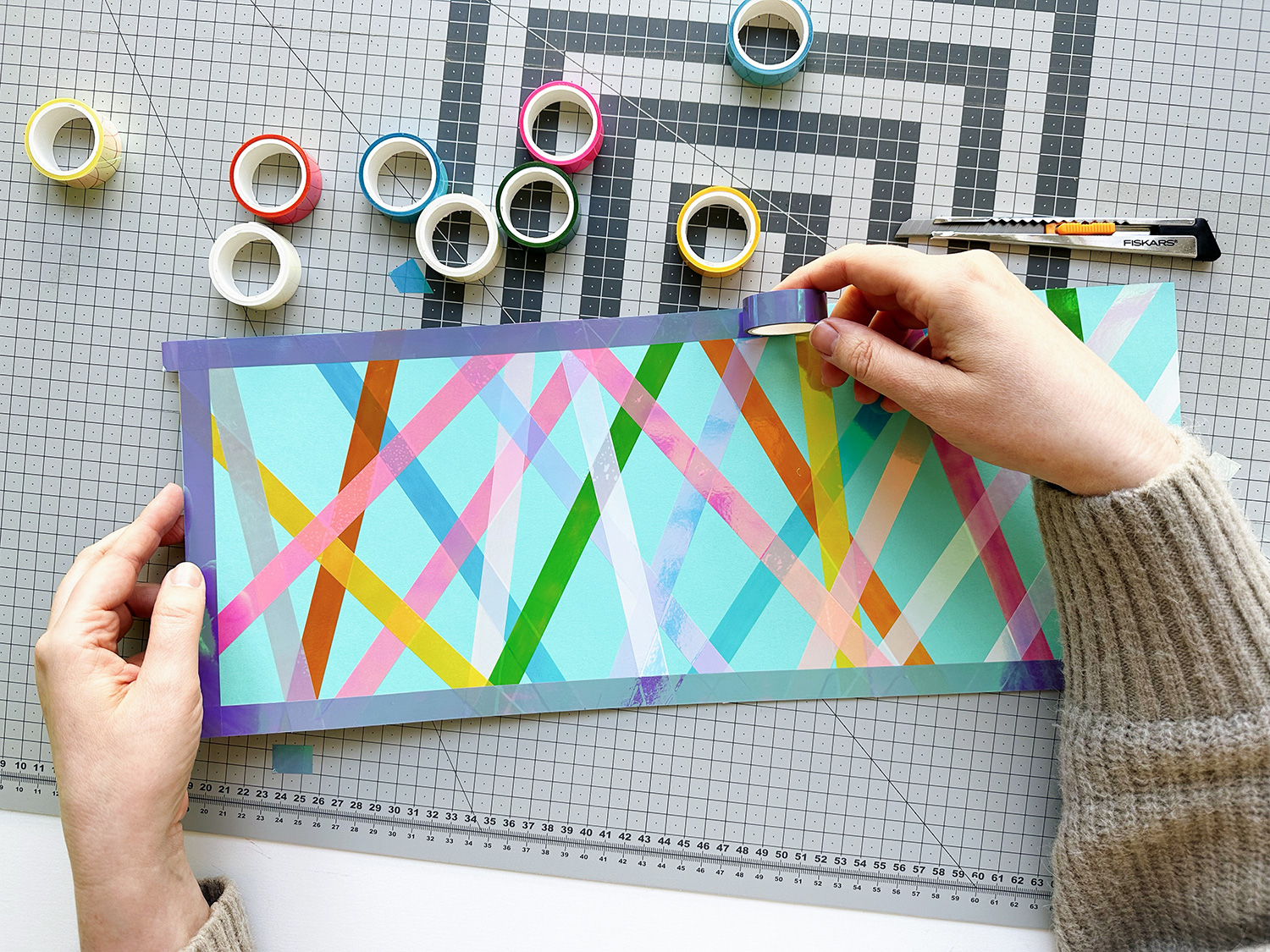 Klebe das Tape einfach über den Rand des Papierzuschnitts und schneide das überstehende Klebeband mit dem Cutter oder der Schere bündig ab.